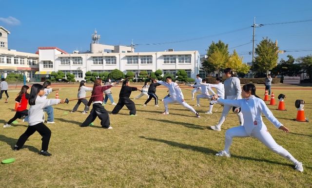 지난 6일 열린 한림초등학교의 \'스포츠 데이\' 펜싱 체험. 제주도 제공