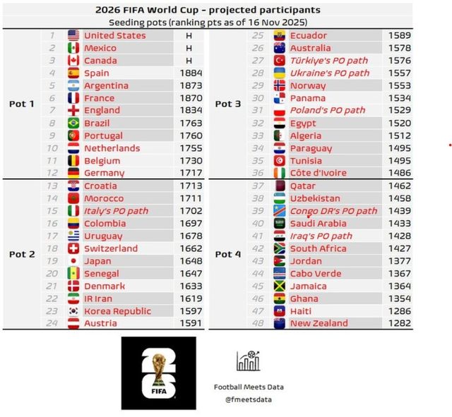 축구 관련 콘텐츠를 다루는 '풋볼 미츠 데이터'는 17일 열린 월드컵 예선이 끝난 뒤 경기 결과를 반영해 월드컵 본선 시드 현황을 새롭게 공개했다. 주목할 만한 부분은 월드컵 본선 진출에 성공한 노르웨이의 포트3 배정, 이탈리아와 콩고민주공화국의 플레이오프 등이었다.