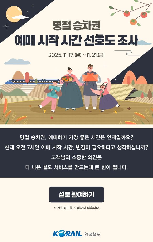 코레일은 현재 오전 7시로 고정된 예매 시간이 이른 데다 직장인과 학생들의 출근·등교 준비 시간과 겹친다는 지적이 꾸준히 제기돼 왔고, 이에 국민이 가장 편하게 예매할 수 있는 시점을 찾기 위해 설문을 마련했다는 설명이다.