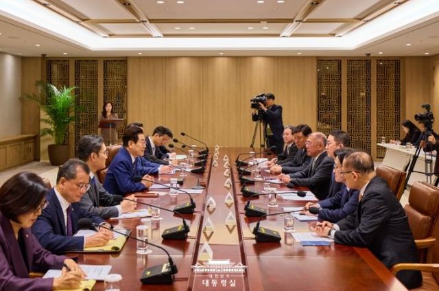 [와이뉴스] 이재명 대통령은 16일 오후 2시부터 2시간 넘게 대통령실 회의실에서 이재용 삼성전자 회장, 최태원 SK그룹 회장, 정의선 현대차그룹 회장, 구광모 LG그룹 회장, 여승주 한화그룹 부회장, 정기선 HD현대 수석부회장, 서정진 셀트리온 회장 등 경제인들과 산업부 장관 그리고 안보실장, 정책실장, 경제안보비서관 등이 참석한 가운데 '관세협상 후속 민관 합동회의'를 주재했다.