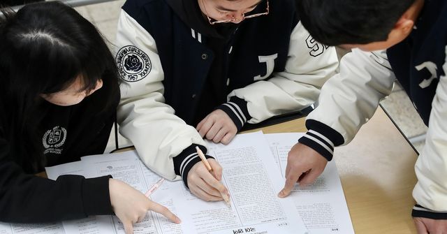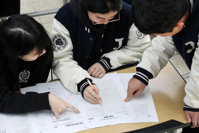 14일 한 고교에서 수험생들이 담임교사와 함께 전날 치른 2026학년도 수능 가채점을 하고 있다. / 뉴스1