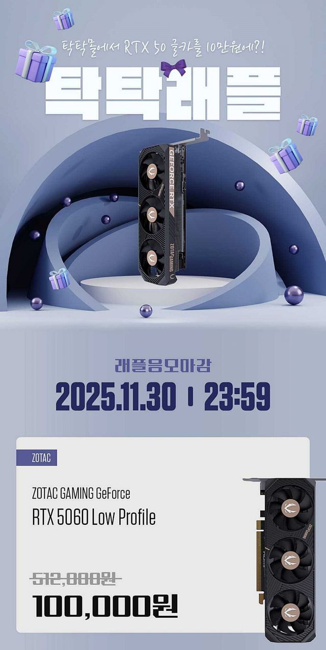 조텍코리아가 11월 래플 이벤트를 운영한다. 대상 제품은 로우 프로파일 설계의 ZOTAC GAMING 지포스 RTX 5060 LP 8GB이며, 추첨 선정 고객 1인에게 제품을 판매가 51만2천 원보다 낮은 10만 원에 구매할 수 있는 혜택이 제공된다. 탁탁몰 회원을 대상으로 신청서를 통해 참여 가능하며, 이벤트는 11월 17일부터 30일까지 진행된다.