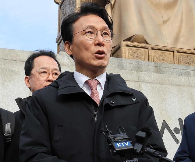 김민석 국무총리가 17일 서울 종로구 광화문광장 세종대왕상 앞에서 감사의 정원 공사현장 방문을 마치고 발언하고 있다. 한국전쟁 참전 22개국에 감사를 표하는 공간으로 참전국의 석재로 만든 총기모양의 조형물 23개가 세워질 예정이다. / 뉴스1