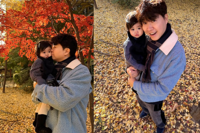 공개된 사진 속 박수홍은 늦가을의 붉은 단풍 나무 아래에서 딸 재이 양을 품에 안고 따뜻한 입맞춤을 하고 있다. 박수홍과 아내 김다예를 똑 닮은 재이는 동그란 눈망울로 카메라를 응시했다.