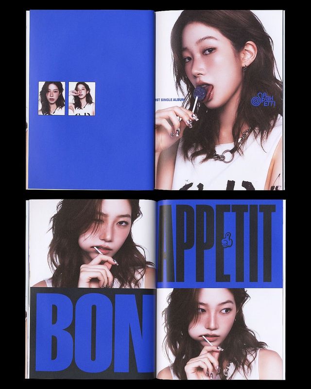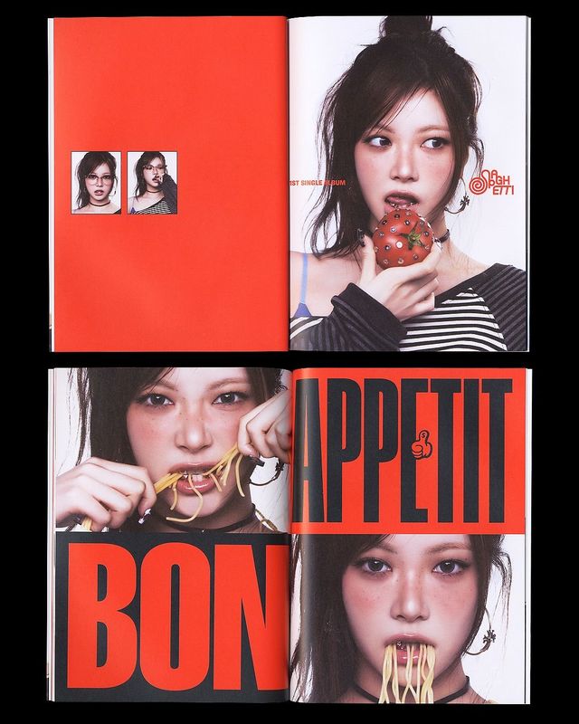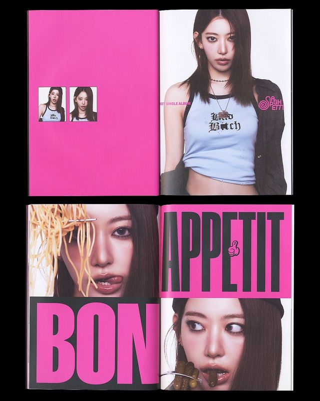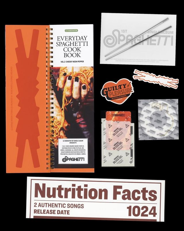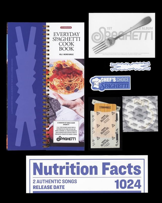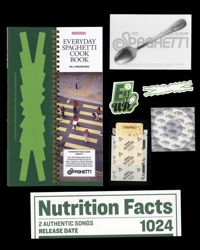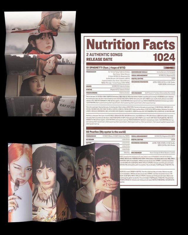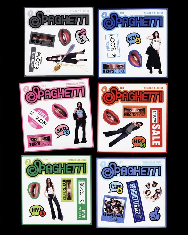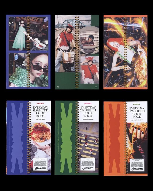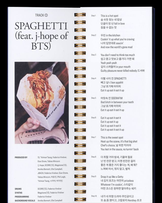 손글씨처럼 비틀린 타이틀, 톡톡 튀는 배색, 살짝 어긋난 레이아웃까지 정리되지 않아 더 파워풀하게 느껴지는 에너지를 담고 있다. 음악이 지닌 독특한 리듬감을 시각으로 완벽히 번역해낸 느낌이랄까. 정형화 되지 않은 스타일을 억지로 구조화하기 보다는 다양한 색과 선으로 경쾌하게 풀어낸 이들만의 쿨-함이 돋보인다. 아직 노래를 들어보지 않은 이들도 “아, 이 앨범은 이런 결이구나” 하고 직감하게 된다. 삐죽 빼죽 빗겨가는 선이 묘하게 르세라핌의 로고와 스파게티 면발을 떠올리게 하는 절묘함! 르세라핌이 그간 보여준 틀을 벗어난 실험적인 도전들이 고스란히 묻어난다 해도 과언이 아니다.