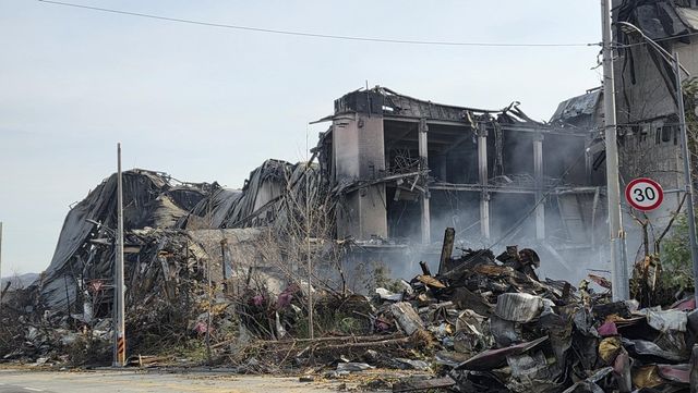 이랜드 물류창고 화재 이틀 째인 16일 충남 천안 동남구 이랜드패션 물류센터 창고가 날이 밝으면서 화재 흔적이 고스란히 드러났다. / 뉴스1