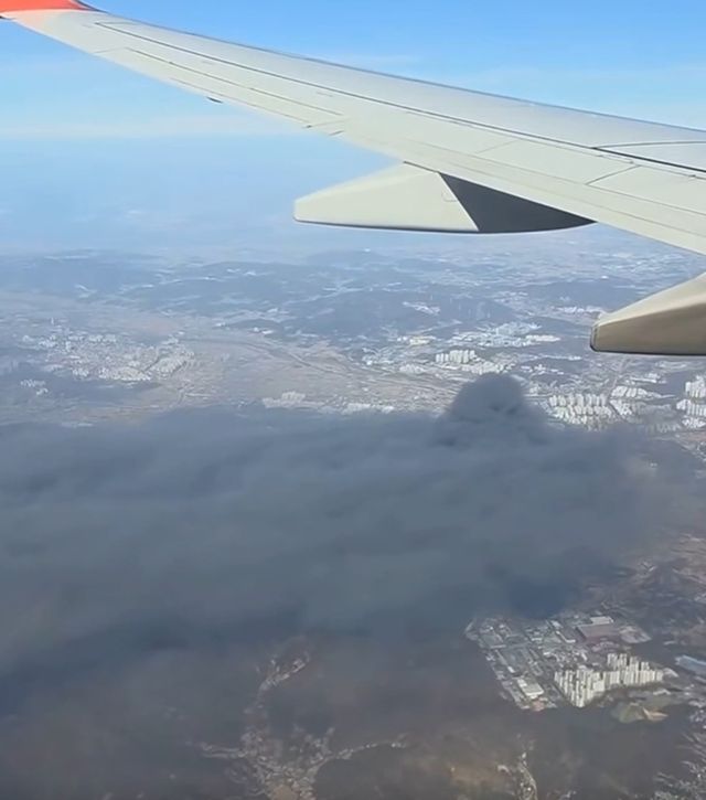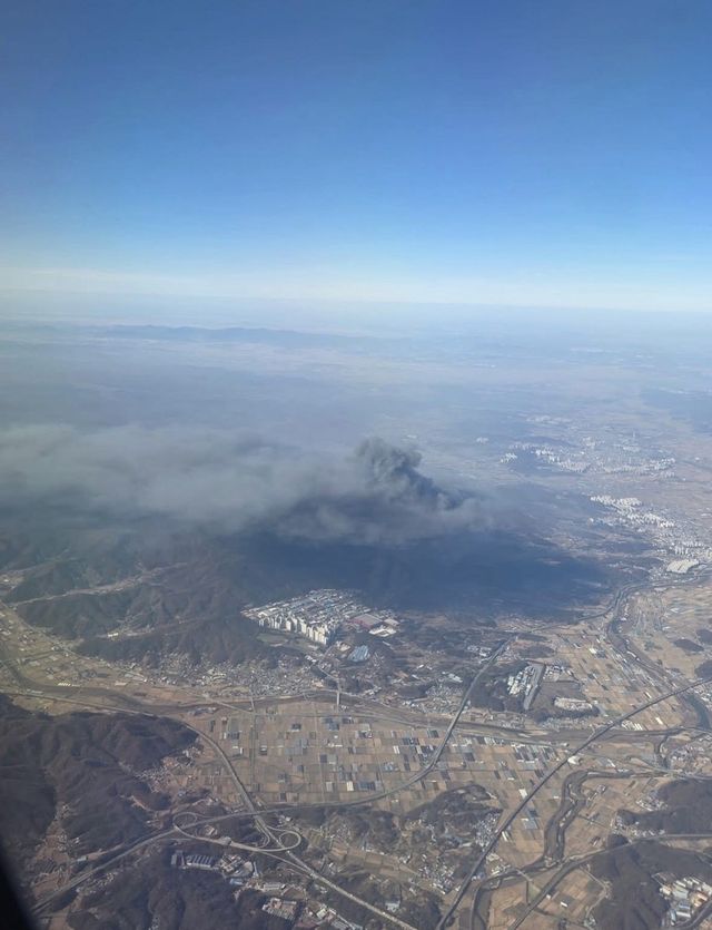 항공기 날개 아래로 펼쳐진 가을 들판 위로, 산 능선을 타고 거대한 검은 연기 기둥이 솟아올랐다. 연기는 마치 산봉우리를 덮치는 구름처럼 번져, 주변 하늘을 어둡게 물들였다. 아래쪽으로는 도로와 마을, 아파트 단지들이 조밀하게 자리해 있어 화재 규모가 더욱 선명하게 대비됐다.