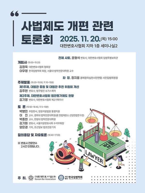 또 김주현 변호사(법무법인 슈가스퀘어)가 '대법관 증원 및 대법관 추천위원회 구성 개선', 김기영 변호사가 '법관평가제도 개선 방안'을 주제로 각각 발표한다.