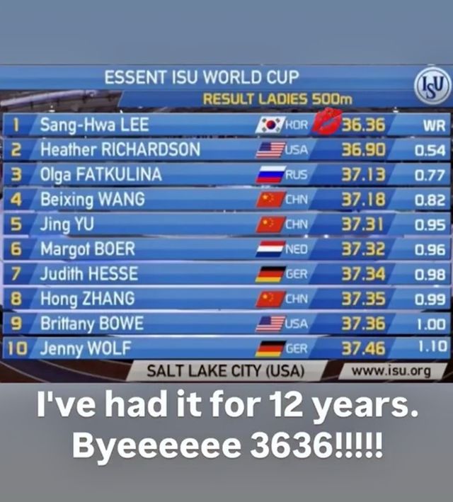 그러나 17일 같은 장소에서 열린 2025~2026 ISU 월드컵 1차 대회 여자 500m 2차 레이스에서 펨케 콕이 36초09로 결승선을 통과하며 이상화의 기록을 0.27초 단축했다. 흥미롭게도 이상화의 기록이 세워졌던 정확히 같은 날짜, 같은 링크에서 새로운 세계기록이 등장했다.