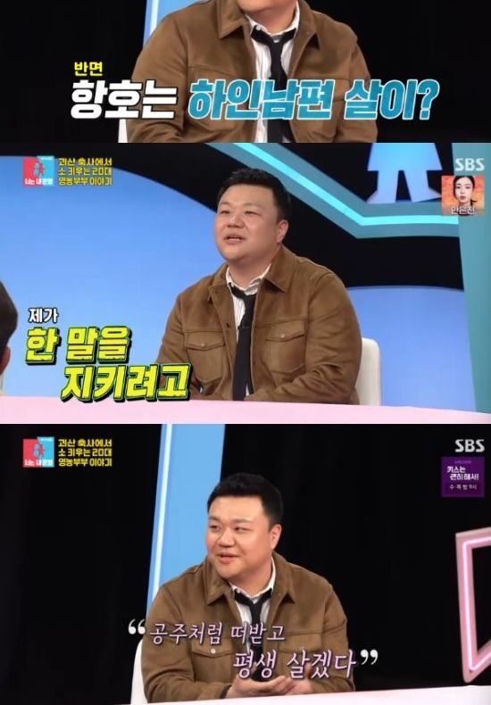 태항호는 "제가 아내에게 신데렐라처럼 살게 해 줄 수는 없겠지만, 공주처럼 떠받들겠다고 했다"면서 "머리도 말려주고 안마도 해주고 있다. 이런 과(?)는 열심히 살아야한다. 꾸준하게 해야한다"고 말해 웃음을 줬다.