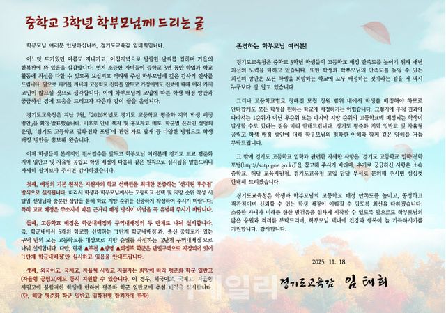한편 서한문은 고교 평준화 지역 교육지원청과 중학교 누리집에 탑재하며 평준화 지역에 지원을 희망하는 비평준화 지역 중학교 학부모는 도교육청 고등학교 입학·전학 포털에서도 확인할 수 있다.