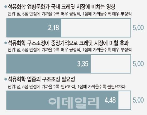 이데일리가 지난달 10일부터 17일까지 국내 크레딧 시장 전문가 총 403명을 대상으로 진행한 36회 신용평가 전문가 설문(SRE)에서 향후 1년 내 업황이 악화할 것으로 예상되는 산업으로 화학업을 가장 많이 꼽았다. 설문 유효 응답자는 222명으로 18개 업종 중 최대 2개까지 복수 응답하도록 설문한 결과 총 436표 중 141표(32.3%)가 화학업종에 집중됐다.