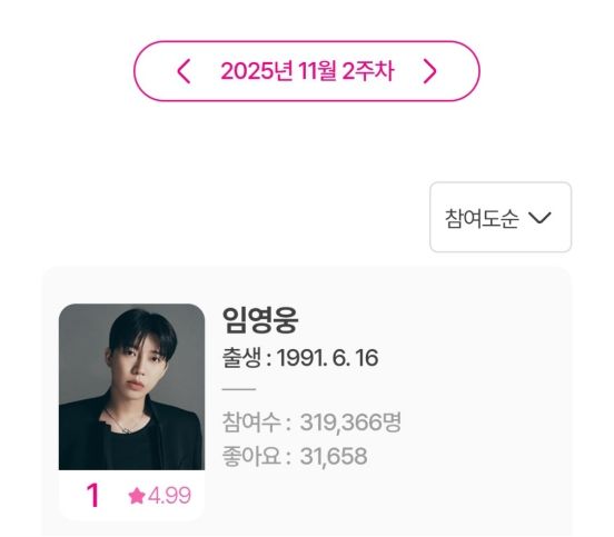아이돌차트에 따르면, 지난 11월 10일부터 11월 16일까지 집계된 평점랭킹에서 임영웅은 31만 9,366표를 얻어 최다득표를 기록했다.