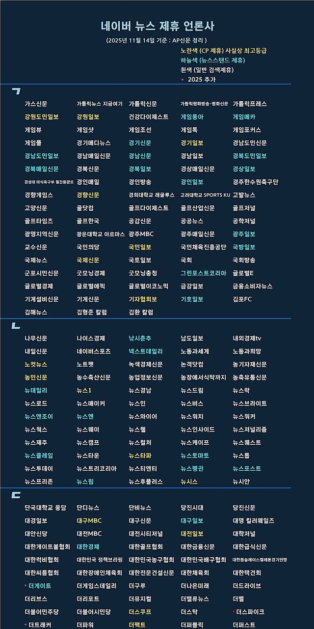 [AP신문 = 미디어동향] AP신문에서 2024년 상반기에 이어 2025년 네이버 뉴스 제휴사 리스트를 정리했다.