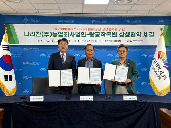 이번 협약식에는 이명남 식품진흥원 사업본부장, 문성호 나리찬 대표, 류형규 왕궁작목반 회장을 비롯한 관계자들이 참석했으며 세 기관은 협약서에 서명하며 상호 협력을 다짐했다.