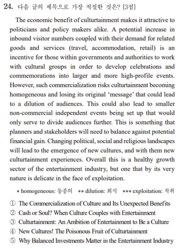 논란의 영어 24번 문항은 ‘문화 콘텐츠가 상업성과 메시지 사이에서 균형을 찾아야 한다’는 취지를 담고 있는데 정답으로 제시된 2번의 표현 ‘Cash or Soul?’ 가운데 ‘soul’이 지문 어디에도 언급되지 않는다는 점이 주요 쟁점이 됐다.