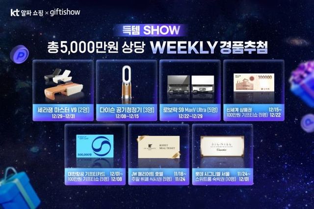 각 서비스를 통합하는 만큼 KT알파 쇼핑 적립금과 기프티쇼 상품권을 교차 증정하는 콜라보 이벤트도 준비했다. KT알파 쇼핑에서 1만원 이상 구매한 고객 대상 추첨을 통해 '기프티쇼 3천원 상품권'(1000명)을 증정하고, 여기에 추가 추첨을 통한 1명에게 '기프티쇼 100만원 상품권'을 지급한다.
