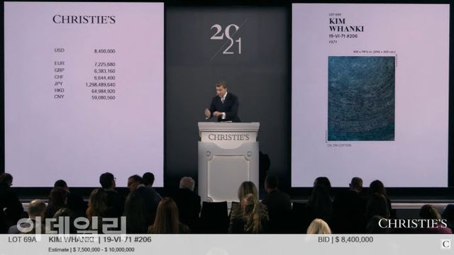 17일(현지시간) 미국 뉴욕 크리스티 경매에서 진행한 ‘20세기 이브닝 세일’에 나선 김환기의 ‘19-Ⅵ-71 #206’(1971)은 840만달러(약 123억 1776만원, 수수료 포함 151억원)에 낙찰, 한국미술품 경매사상 두 번째로 비싼 그림이 됐다.