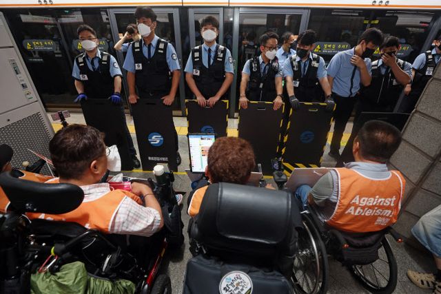 종로경찰서는 18일 오전 광화문역에서 열린 전장연 집회 참가자 A씨를 현행범 체포했다고 밝혔다.