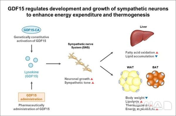 그러나 이번 연구에서 김지윤 교수팀은 GDF15가 단순히 액셀러레이터를 밟는 데 그치지 않고, '엔진 자체를 키우는' 역할, 즉 교감신경세포의 성장과 발달을 촉진한다는 사실을 새롭게 밝혀냈다. 교감신경은 우리 몸의 에너지 소비를 조절하는 신경망으로, 지방세포에 신호를 보내 열을 발생시키거나(열생성) 에너지를 소모하게 만드는 역할을 한다.