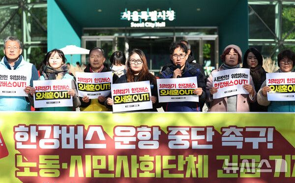 뉴시스 보도에 따르면, 서울지역 315개 노동·시민사회단체로 구성된 '오세훈OUT!공동행동'은 이날 오전 서울 중구 시청 앞에서 긴급 기자회견을 열고 한강버스의 전면 재검토를 거듭 촉구했다.