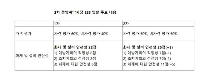 특히 ‘화재 안전성’ 배점을 기존보다 대폭 늘렸다. 기존에는 ‘화재 및 설비 안전성’ 배점이 22였는데 25점으로 3점 늘었다. 세부 항목에서도 ‘화재에 대한 안전성’에 대한 배점이 6점에서 11점으로 5점이나 올랐다. 전력거래소는 화재 안전 평가 강화를 위해 전문가를 별도로 구성해 평가위원으로 참여시킨다는 계획이다.