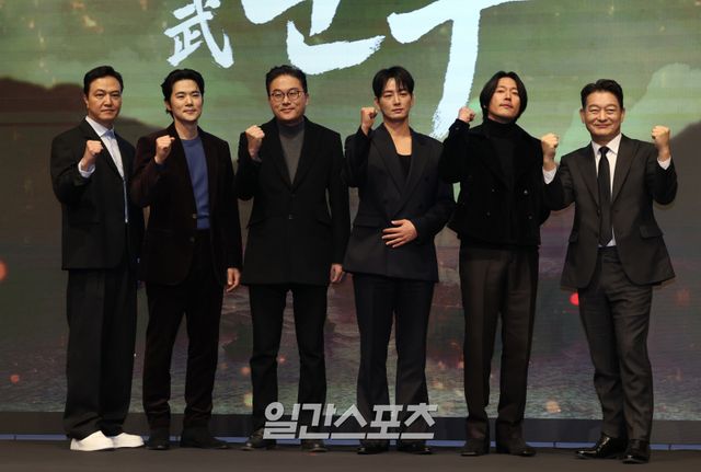 배우 정웅인, 김강우, 김영조 감독, 이현욱, 장혁, 조성하가 18일 오후 서울 구로구 더세인트에서 열린 KBS 새 대하드라마 '문무' 제작보고회 참석해 포토타임을 갖고 있다. '문무는' 약소국 신라가 고구려, 백제를 넘어 당나라까지 물리치고, 삼국통일을 완성한 위대한 승리의 역사를 조명하는 역사 드라마. 서병수 기자 qudtn@edaily.co.kr /2025.11.18/