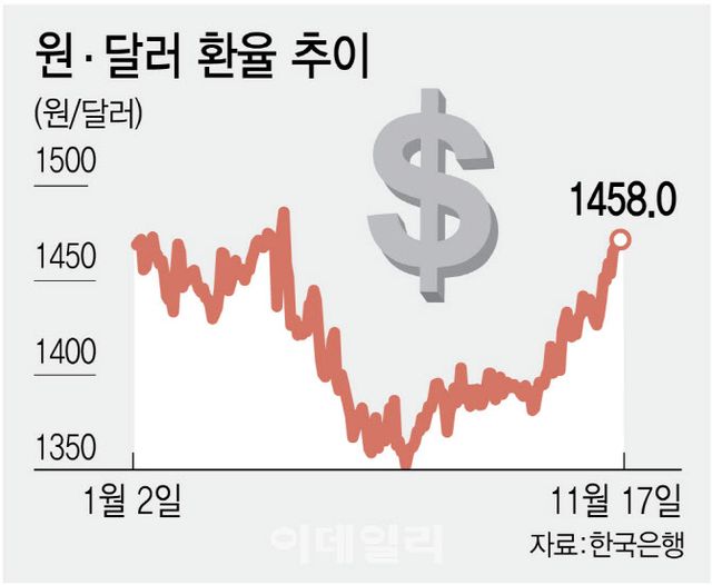 연말까지 뚜렷한 하락 요인이 보이지 않는 데다, 내년에도 미 금리 인하 속도와 글로벌 경기 둔화가 엇갈리며 1400원대 체류가 장기화할 것이란 전망이 확산되고 있다.