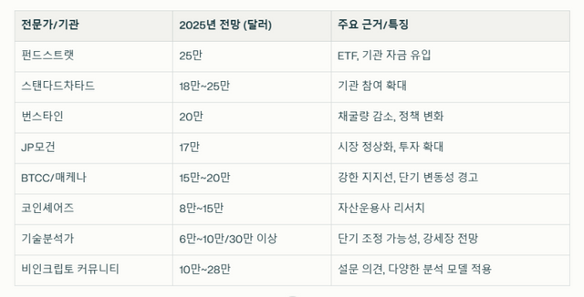 아레테 캐피탈 매케나 등은 2025년 말 15만~20만 달러를 예측하며, 현재 가격대의 강한 지지선을 언급했습니다.