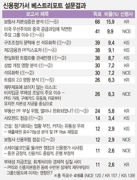 베스트리포트 2위엔 NICE신평의 ‘미국 우선주의와 중국 공급과잉에 직면한 주요 그룹 이슈’ 시리즈가 총 41표(9.8%)로 이름을 올렸다. 올해 미국 도널드 트럼프 정부의 관세 이슈가 시장에서 가장 뜨거운 관심을 받았던 만큼 5위 한신평의 ‘현실화된 트럼프發 관세전쟁’(36표, 8.6%), 8위 한기평의 ‘트럼프 2.0 영향 분석’(26표, 6.25%) 등 3개 신평사가 모두 관련 보고서를 냈다.