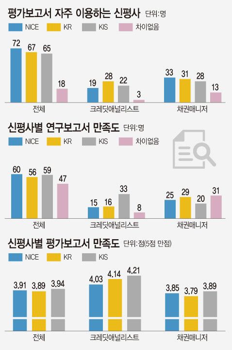 다만 직군별 선호도는 연구보고서 만족도와 마찬가지로 나뉘었다. 전통적으로 CA 그룹의 지지를 받던 한기평이 올해 평가보고서를 가장 자주 이용하는 곳을 묻는 조사에서도 28표(12.6%)로 가장 많은 득표에 성공했고 한신평이 22표(9.9%), NICE신평이 19표(8.5%) 순으로 표를 얻었다. 반면 비 CA 중에선 53표(23.8%)가 NICE신평에 집중됐다. 2위 한신평은 43표(19.3%), 3위 한기평은 39표(17.5%)를 얻었다.