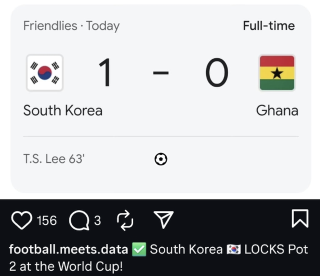 지난 14일 볼리비아전(2-0 승)에 이어 11월 A매치에서 2연승을 내달린 홍명보호는 이날 결과로 포트2 진입이 확정됐다. 만약 FIFA 랭킹 차이가 큰 가나에 패배했다면 FIFA 랭킹 포인트가 크게 깎일 우려가 있었지만, 답답한 경기력 속에서도 다행히 이태석의 귀중한 선제 결승골이 터지면서 현재 순위를 유지한 채 2025년 A매치 일정을 마칠 수 있었다.