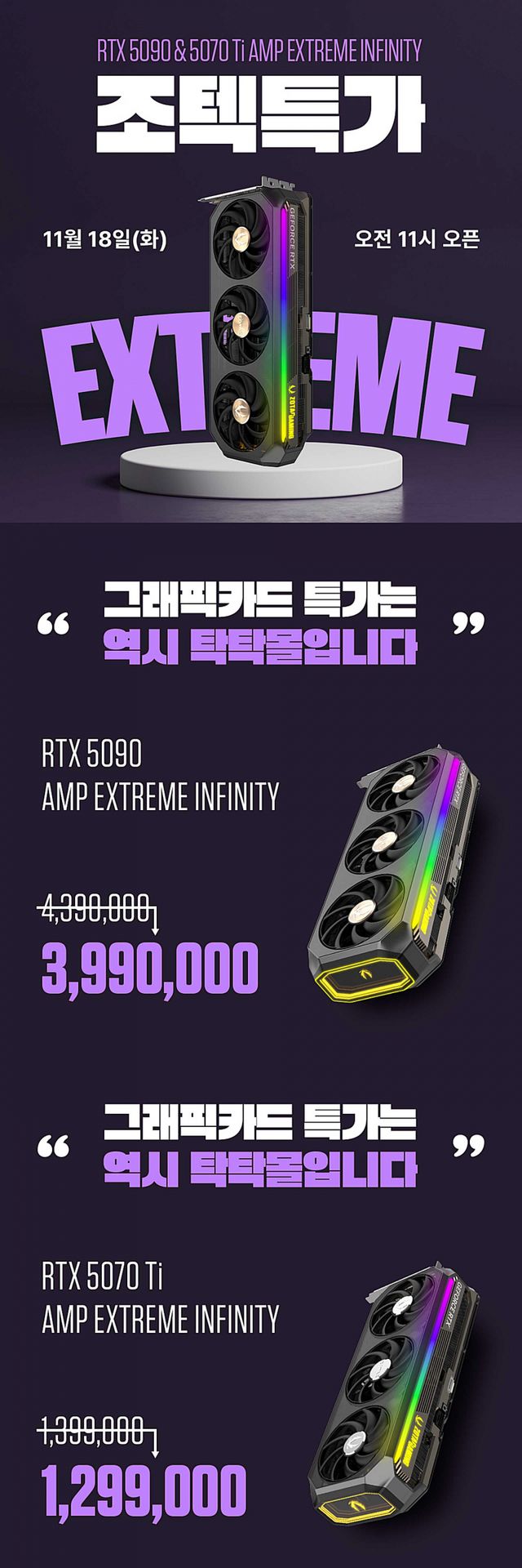특가는 조텍코리아 공식 쇼핑몰 탁탁몰에서 11월 18일 오전 11시부터 11월 20일까지 운영되며, 재고 소진 시 조기 종료된다. 가격은 RTX 5090 AMP Extreme Infinity 3,990,000원, RTX 5070 Ti AMP Extreme Infinity 1,299,000원이다.
