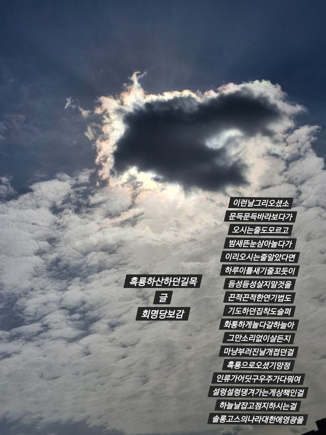 이런날그리오셨소 문득문득바라보다가 오시는줄도모르고 밤새뜬눈삼아놀다가 이리오시는줄알았다면 하루이틀새기줄꼬듯이 듬성듬성살지말것을 끈적끈적한연기법도 기도하던집착도슬퍼 화통하게놀다갈하늘아 그만소리없이살든지 마냥부러진날개접던걸 흑룡으로오셨기망정 인류가어딧구우주가다뭐여 설렁설렁댕겨가는게상책인걸 하늘날잡고점지하시는걸