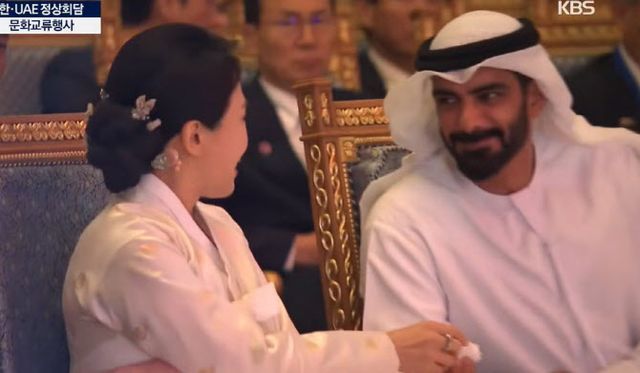 김 여사가 연신 손으로 눈물을 닦아내자 옆자리에 앉아 있던 UAE 관계자가 휴지를 건네주기도 했다. 조 씨의 노래가 절정에 달하자 김 여사는 박수를 치며 감정이 북받쳐 오른 듯한 모습도 보였다.