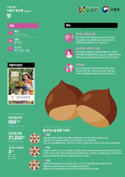 김용진 산림청 사유림경영소득과 과장은 “밤은 우리 산림이 주는 가을의 대표 선물로 영양과 맛이 모두 뛰어나다”며 “앞으로도 임산물이 국민의 식탁에서 다양하게 활용될 수 있도록 지원을 강화하겠다”고 말했다.
