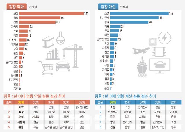 업황 개선이 기대되는 업종 1위에는 35회와 마찬가지로 조선업이 이름을 올렸다. 조선업은 총 응답자 428명(응답자 222명, 18개 업종 중 최대 2개 복수응답) 중 119명(27.8%)의 선택을 받았다. 견조한 수주잔고를 유지한 상황에서 ‘마스가(MASGA·미국 조선업을 다시 위대하게)’ 등 호재에 대한 기대감이 반영된 결과로 풀이된다. 실제 업계에서는 HD한국조선해양, 한화오션, 삼성중공업 등 국내 주요 조선 3사가 3년치 일감을 확보한 것으로 보고 있다. 최근 액화천연가스(LNG) 운반선을 비롯한 신규 선박 수주가 줄고 있지만 슈퍼사이클(초호황)에 올라탄 만큼 당분간 성장이 지속될 것이란 전망에 힘이 실린다.