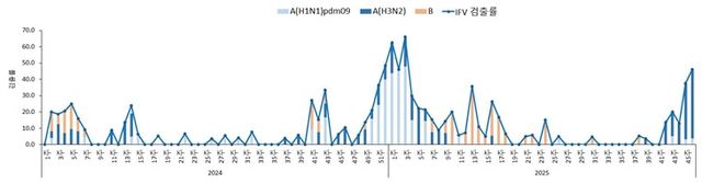 19일 도 보건환경연구원에 따르면 제주 지역 주차별 인플루엔자 검출률은 42주 13.6%, 43주 20%, 44주 13%, 45주 37.5%, 46주 46.2%로 전반적인 증가 추세를 보이고 있다. 전국 평균(44주 19%, 45주 35.1%)과 비슷한 수준이다.