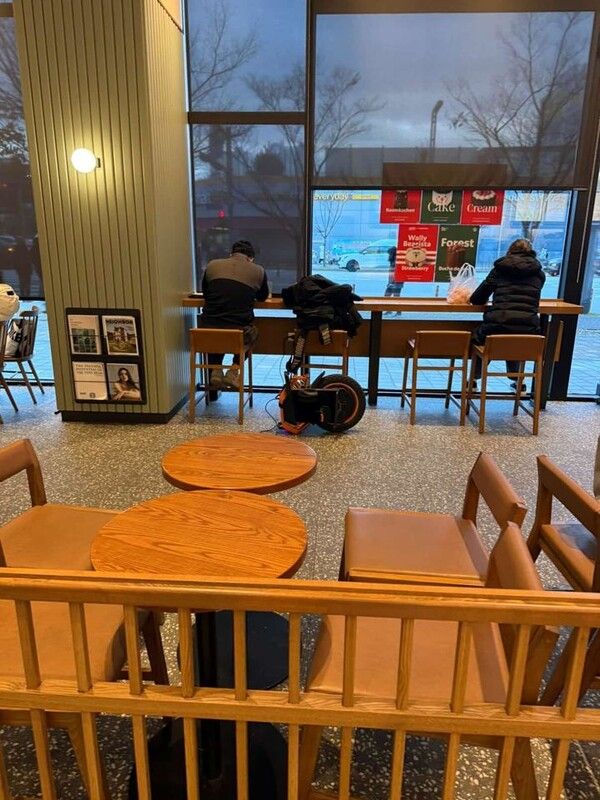 공개된 사진에는 창가 쪽 테이블에 앉은 남성 옆쪽으로 충전 줄이 꽂힌 전동휠의 모습이 눈에 띈다.