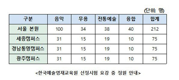 모집 기간은 오는 12월 1일부터 4일까지며, 서울 본원은 총 212명, 지역캠퍼스(세종·경남통영·광주)는 각 75명씩 선발한다. 모든 캠퍼스는 음악·무용·전통예술·융합 총 4개 분야에서 교육생을 모집하나, 분야별 모집 인원은 상이하다.