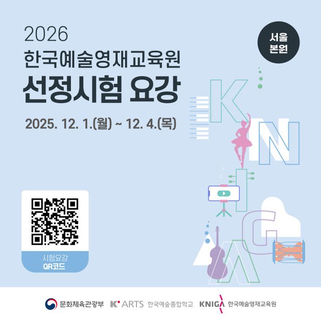 2026년도 한국예술영재교육원 교육생 모집에 관한 자세한 내용은 한국예술영재교육원 홈페이지에서 확인하면 된다.