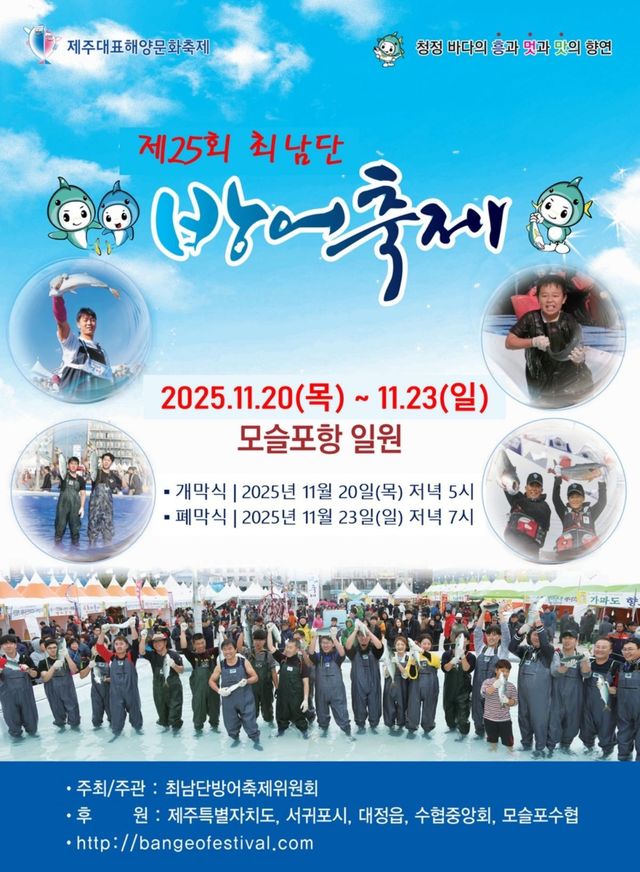 개막 행사는 20일 오후 5시 모슬포항 축제장에서 진행되며 이후 축제 기간 동안 방어를 직접 보고 맛보고 즐길 수 있는 프로그램이 이어질 예정이다. 대방어 해체 퍼포먼스를 비롯해 방어 맨손잡기, 방어 경매 체험, 가두리 방어 낚시, 대방어 시식회 등이 준비돼 방문객들의 참여를 유도한다.