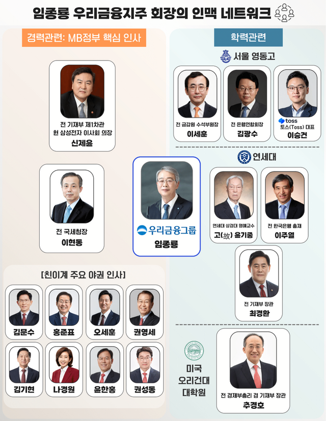 최근 임종룡 우리금융그룹 회장에 대한 여론의 관심이 남다르다. 우리금융그룹이 차기 회장 선임 절차에 본격 착수하면서 임 회장의 연임 여부가 관심사로 떠올랐기 때문이다. 덕분에 그의 이력, 직전 임기 기간 동안의 경영적 성과, 인적 네트워크 등도 덩달아 관심을 받고 있다. 그 중에서도 특히 임 회장의 인적 네트워크에 유독 많은 시선이 쏠리고 있다. 규제 산업이자 공공재로 인식되는 금융그룹 특성상 인적 네트워크 활용 능력이 경영 성과에도 직·간접적인 영향을 미치는 탓이다.