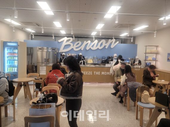 최근 용산역 3번출구 쪽 대합실에 문을 연 한화그룹 프리미엄 아이스크림 ‘벤슨’ 매장을 19일 오후 1시께 찾자 주 메뉴인 아이스크림뿐 아니라 커피를 즐기려는 이들이 적지 않았다. 93제곱미터(m2·28평) 크기 매장에 있는 12개 테이블(24개 좌석) 위에는 아이스크림 컵보다는 커피 컵이 많이 놓여있었다. 계절이 초겨울로 접어든 데다 대합실 특성상 기다리는 등 자투리 시간을 따뜻한 음료 한잔을 마시며 여유있게 보내려는 유동인구가 많았기 때문으로 보인다.