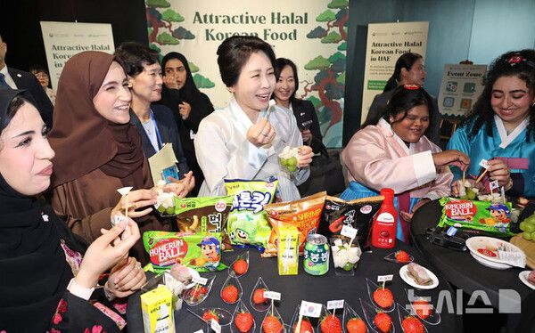 뉴시스 보도에 따르면, 김 여사는 이날 주UAE 한국문화원에서 열린 '할랄 인증 K(케이) 푸드 홍보 행사'에 참석했다. 할랄(Halal)은 아랍어로 '허용된·합법적'이란 뜻이다. 할랄 인증 K-푸드는 이슬람 율법에 따라 원재료·제조·포장 과정이 할랄 기준을 충족한 한국산 식품을 말한다.