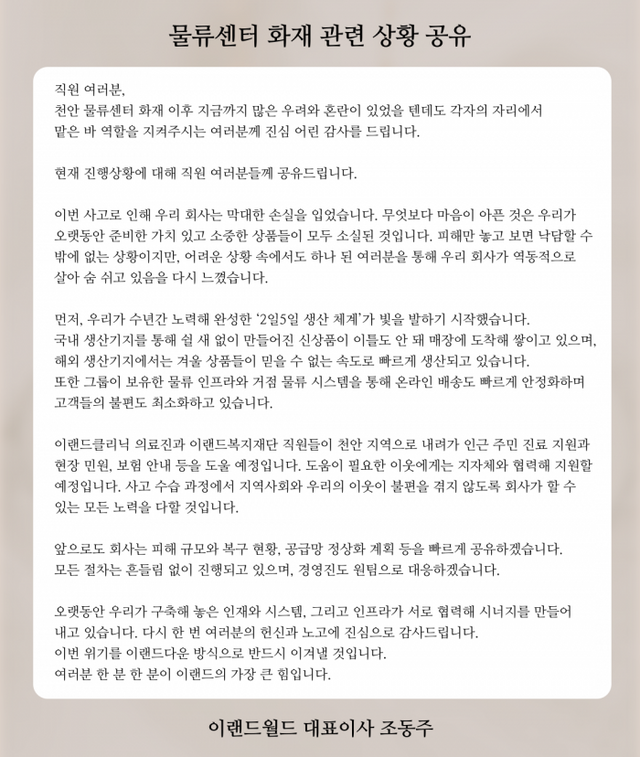 조동주 이랜드월드 대표는 이날 직원들에게 소통문을 발송하고 "오랫동안 우리가 구축해 놓은 인재와 시스템, 그리고 인프라가 서로 협력해 시너지를 만들어 내고 있다"며 "모든 절차는 흔들림 없이 진행되고 있으며, 경영진도 원팀으로 대응하겠다"고 직원들을 격려했다.