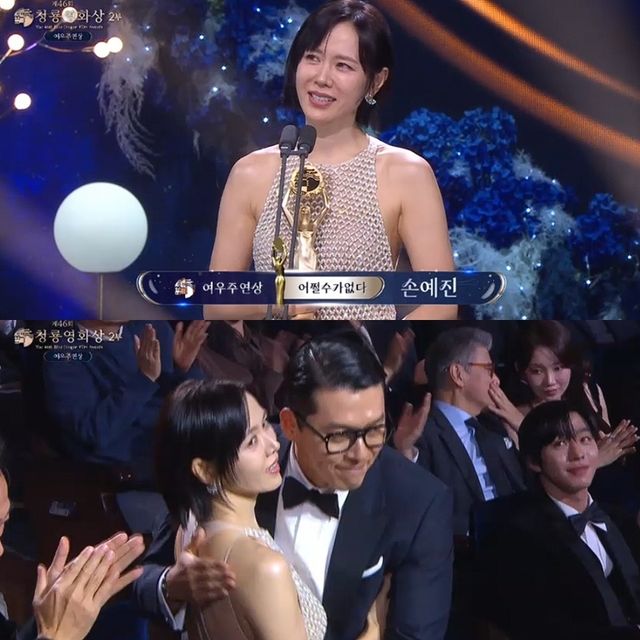 호명된 순간 손예진은 믿기지 않는 듯 자리를 일어섰고, 옆에 앉아 있던 남편 현빈이 크게 환하게 웃으며 박수로 축하했다. 두 사람의 모습은 중계 화면에 잡히며 현장을 더욱 뜨겁게 달궜다.