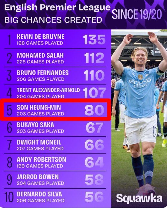 5위는 다름 아닌 손흥민이었다. 손흥민은 2019-2020시즌부터 5년 동안 프리미어리그 203경기에 출전해 빅 찬스 80개를 기록했다.