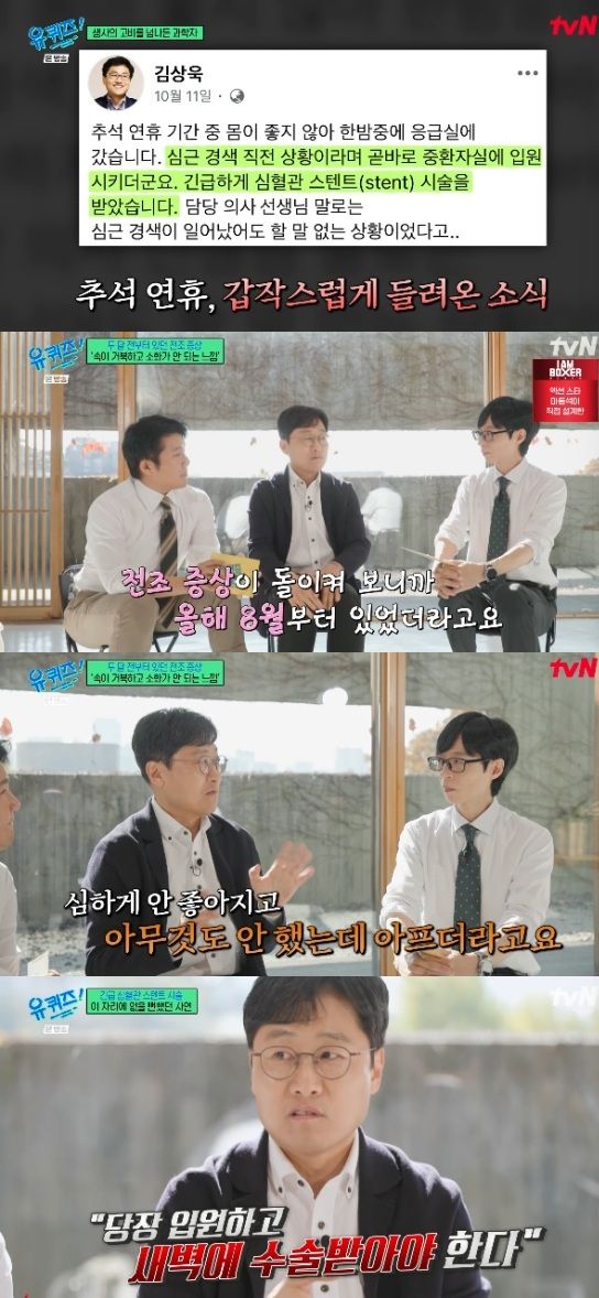 (엑스포츠뉴스 오승현 기자) 급성 심근경색으로 위기를 겪었던 김수용에 이어 갑작스러운 중환자실 입원을 고백한 김상욱 교수의 이야기가 공개됐다.