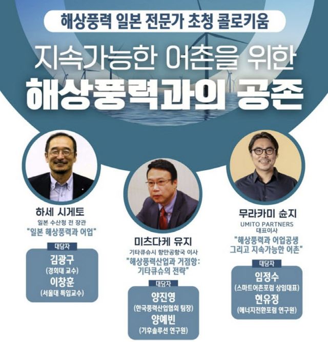 관련해 20일 토론회에서는 하세 시게토 일 수산청 전 장관이 김광구 경희대 교수, 이창훈 서울대 특임교수와 ‘일본 해상풍력과 어업’ 주제로 대담을 진행한다. 이어 미츠다케 유지 기타큐슈시 항만공항국 이사가 양진영 한국풍력산업협회 팀장, 양예빈 기후솔루션 연구원과 ‘해상풍력 산업과 거점항: 기타큐슈의 전략’ 주제로 대담을 이어간다. 무라카미 슌지 UMITO Partners 대표이사는 임정수 스마트어촌포럼 상임대표, 현유정 에너지전환포럼 연구원과 ‘해상풍력과 어업공생 그리고 지속가능한 어촌’ 주제로 대담을 진행할 예정이다.